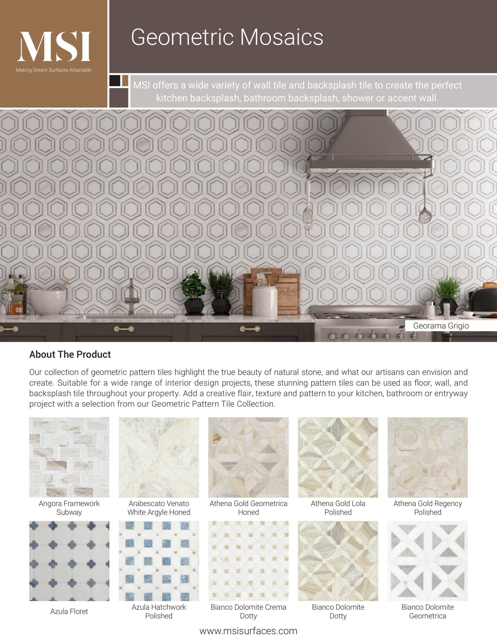 Our exquisite collection of geometric tiles and patterns showcases the natural beauty of stone. From striking geometric floor tiles to charming patterned wall tiles and backsplashes, these options are perfect for various interior design projects. Infuse creativity into your kitchen, bathroom, or entryway with any tile from our Geometric Pattern Tile Collection.