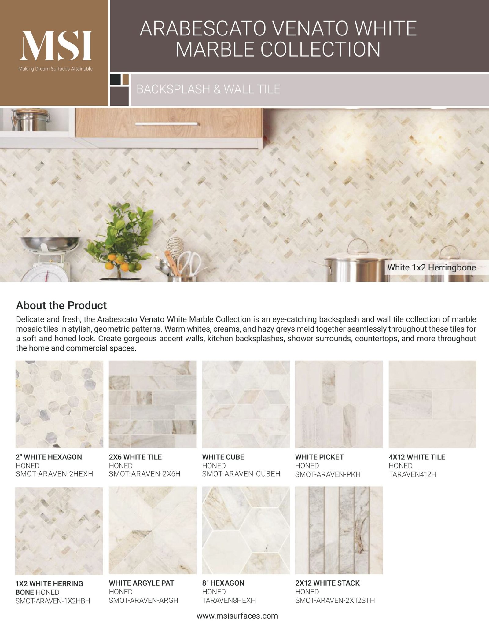 The Arabescato Venato White Marble Collection features delicate and refreshing marble mosaic tiles, showcasing stylish geometric patterns. A harmonious blend of warm whites, creams, and soft greys creates a refined, honed appearance. These tiles are perfect for enhancing accent walls, kitchen backsplashes, shower surrounds, countertops, and more in both residential and commercial settings.