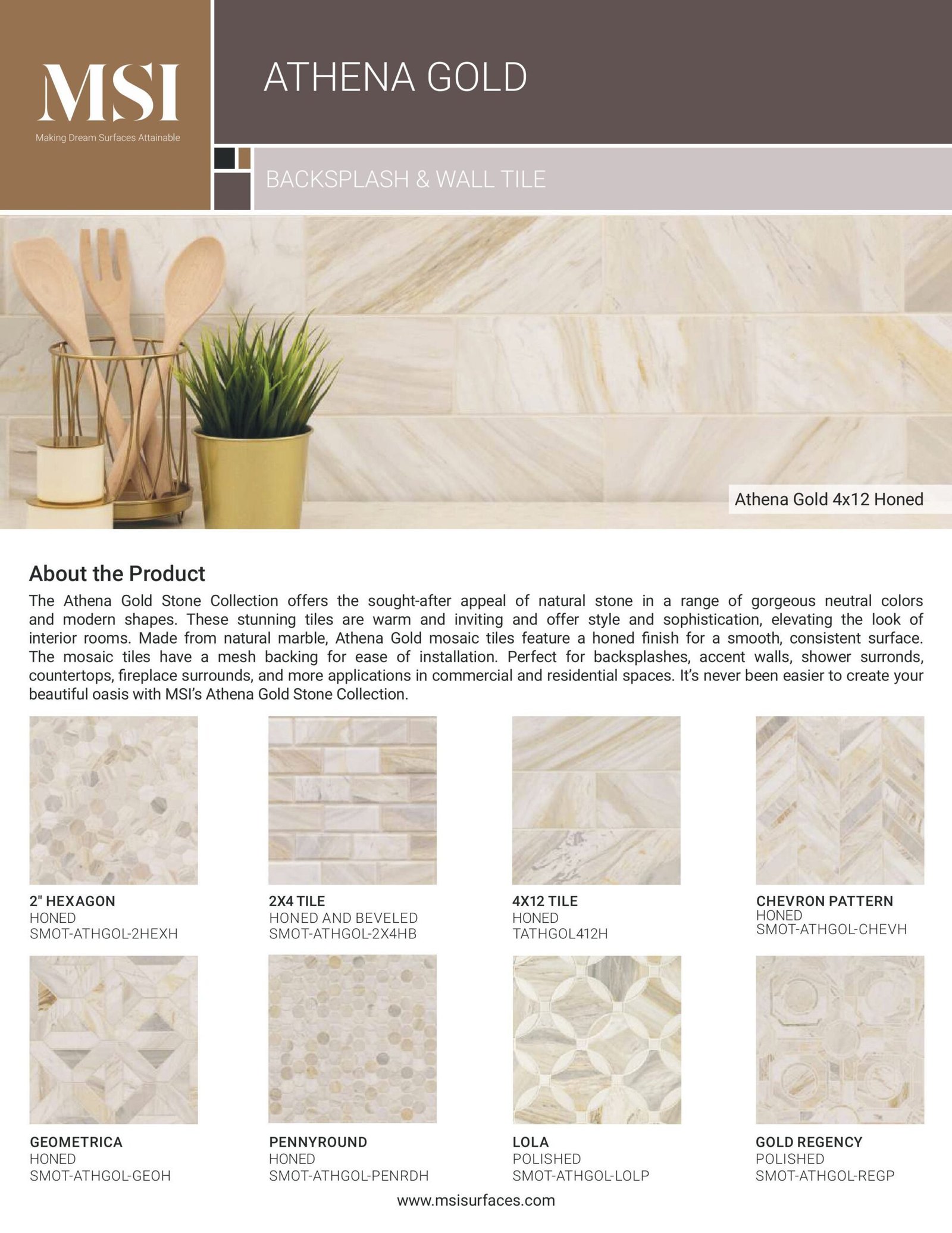 The Athena Gold Stone Collection presents the desirable elegance of natural stone in a variety of beautiful neutral hues and contemporary shapes. These captivating tiles add warmth and sophistication, enhancing the aesthetic of any interior space. Crafted from natural marble, Athena Gold mosaic tiles feature a honed finish for a smooth, uniform surface and come with a mesh backing for easy installation. Ideal for backsplashes, accent walls, shower surrounds, countertops, fireplace surrounds, and more, this collection is perfect for both commercial and residential applications. Creating your dream oasis with the Athena Gold Stone Collection has never been easier.