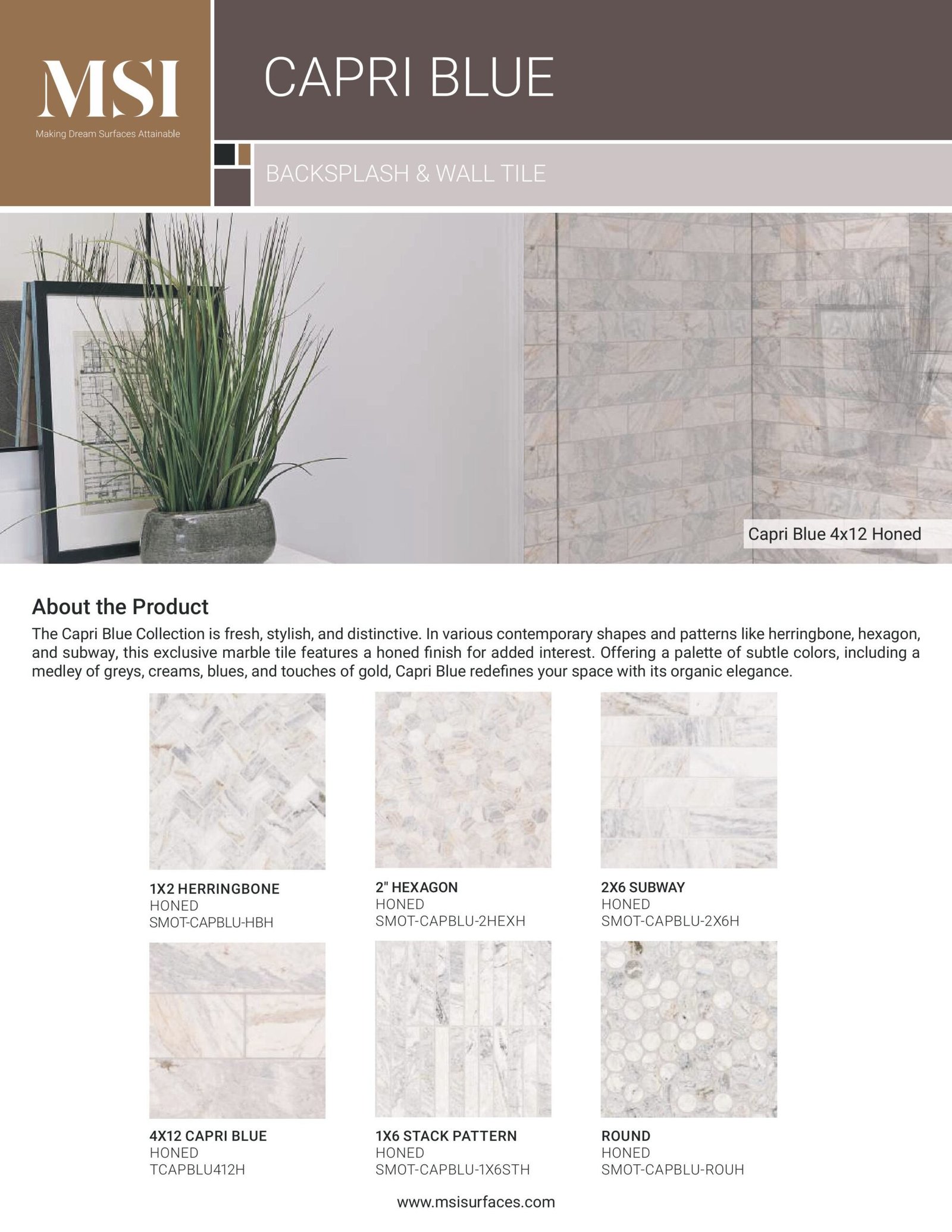 The Capri Blue Collection is vibrant, trendy, and unique. Featuring a variety of modern shapes and patterns such as herringbone, hexagon, and subway, this exclusive marble tile has a honed finish that adds depth. With a palette of soft hues, including a blend of grays, creams, blues, and hints of gold, Capri Blue brings an organic elegance that transforms your space.